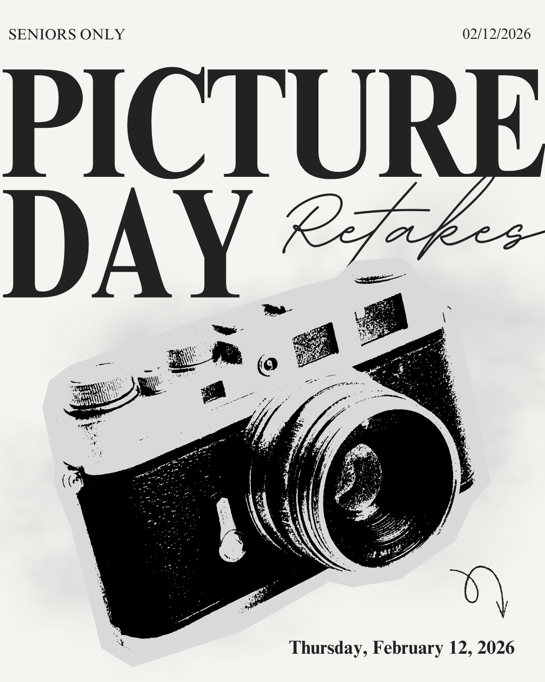 Attention, seniors! Thursday, February 12, 2026, is scheduled to be Picture Re-Takes! This is a chance for you to either retake the picture with your cap and gown, or if you did not take one the first time. Dress to impress and bring your best smile as you pose for your official senior portraits.