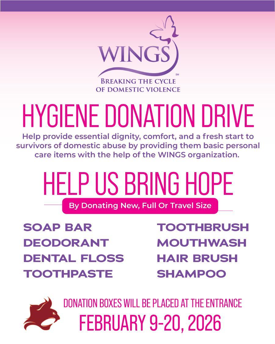 Help make a difference in the lives of domestic violence victims by donating essential hygiene items. Items must be new and unopened, full size are preferred. Thank you in advance, Bobcats, for helping spread kindness and making a difference!