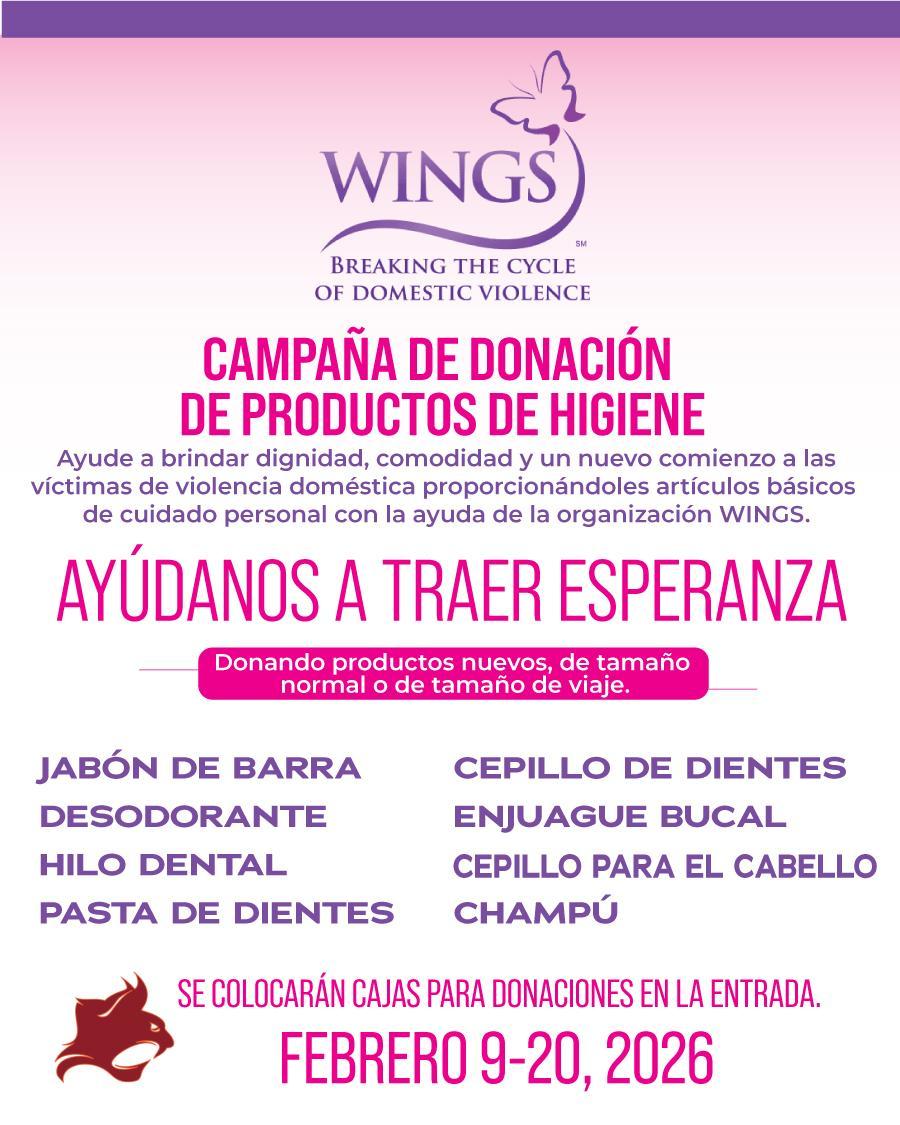 Ayuda a mejorar la vida de las víctimas de violencia doméstica donando artículos de higiene esenciales. Los artículos deben ser nuevos y sin abrir, preferiblemente de tamaño normal. ¡Gracias de antemano, Bobcats, por ayudar a difundir la bondad y marcar la diferencia!