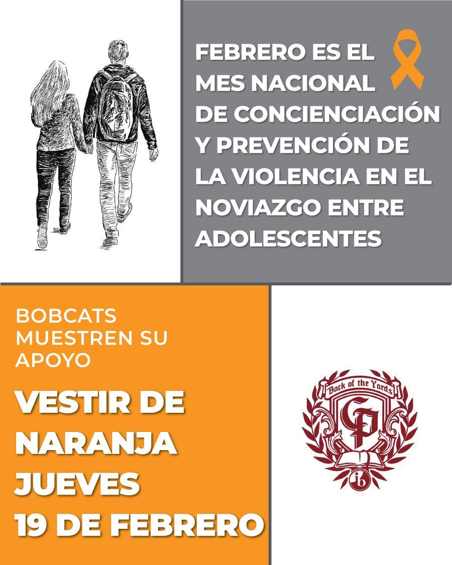 Febrero es el Mes de Concientización sobre la Violencia en las Relaciones de Pareja entre Adolescentes, un momento para educar, empoderar y promover las relaciones saludables. Los estudiantes pueden mostrar su apoyo vistiendo de naranja el jueves 19 de febrero para promover la seguridad, el respeto y las relaciones saludables.