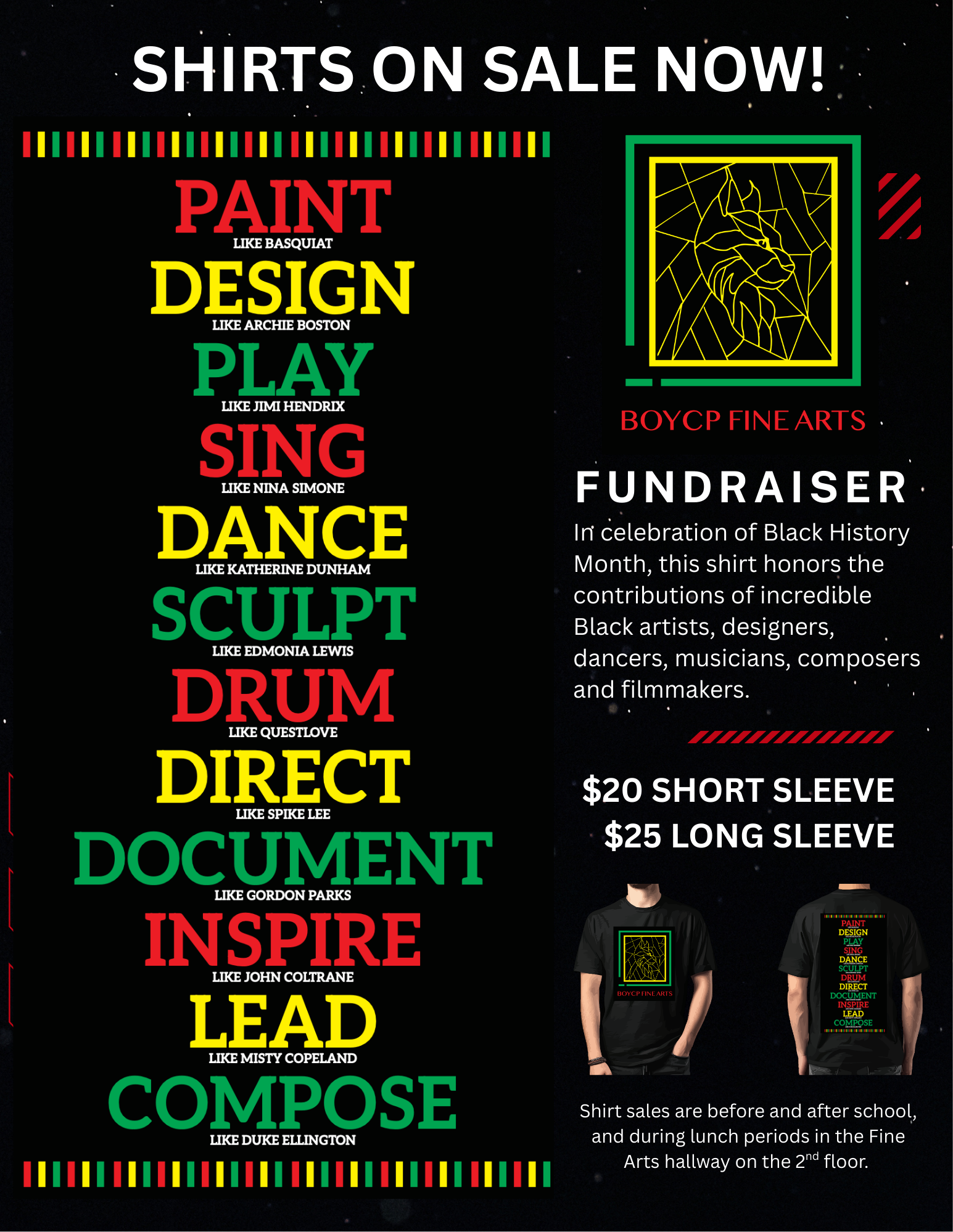 In celebration of Black History Month, the Fine Arts Department is hosting a t-shirt fundraiser. The shirt honors the contributions of incredible Black artists, designers, dancers, musicians, composers, and filmmakers. It will be $20 for a short sleeve and $25 for a long sleeve. Shirt sales are before and after school, and during lunch periods in the Fine Arts hallway on the 2nd floor!